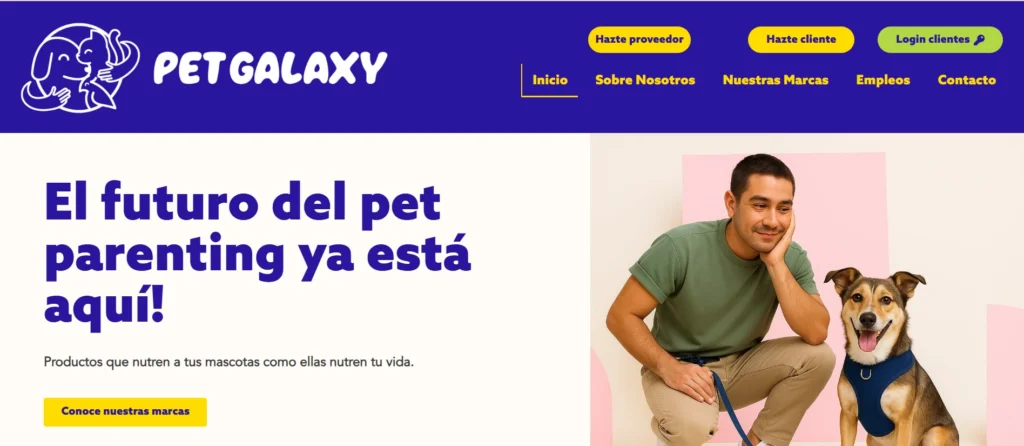Pet Galaxy opera como una empresa matriz que gestiona diversas marcas de consumo. Al ser una compañía de nueva creación, no contaban con una base digital centralizada. Su necesidad era puntual, requerían un portal corporativo que sirviera como punto de validación para proveedores y distribuidores. El sitio debía comunicar solidez operativa para cerrar tratos B2B, sin perder la identidad fresca propia de su sector.
